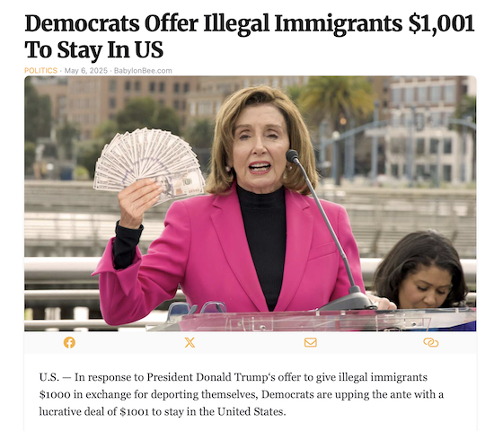 5. “In related news, the Trump Administration will now pay illegal immigrants like Ximena and her parents to self-deport. What an excellent idea! I wonder why nobody thought of that before.”