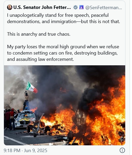 Yes, only Sen. Fetterman among Democrats has the integrity to call the riots in Los Angeles what they are. Next, I’d like him to admit that his party caused this, with its illegal “sanctuary cities,” its deliberate failure to enforce immigration laws and secure the border, and its romanticizing of illegal immigrant status.