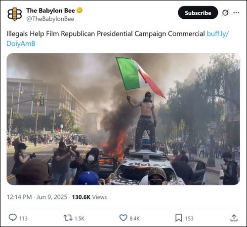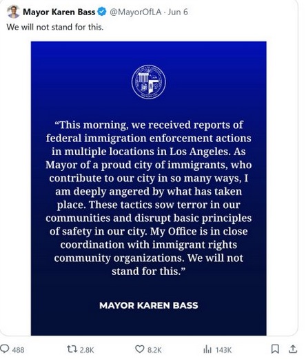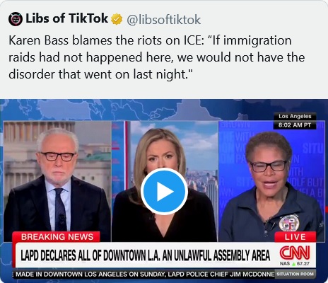 Bass is really something, isn’t she? Blaming the riots on ICE is like blaming a fire on the fire department. If California hadn’t made the state a magnet for immigration law-breakers, ICE wouldn’t have to hold raids. This is another reason why Trump is right to send in the Marines. People as addicted to Bizarro World values and logic as Newsom, Bass and California Democrats can’t be reasoned with or persuaded.