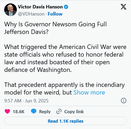 California is doubling down. Their Attorney General Bonta announced that he is suing the Trump administration “As a result, I, in partnership with Governor Gavin Newsom are suing President Trump and asking the court to set aside the president’s action federalizing the California National Guard.”