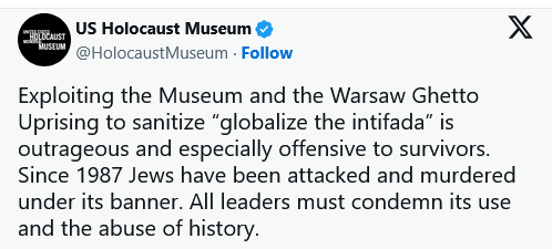 While generally sucking up to him yesterday, “Meet the Press’s” current Axis hack Kristen Welker asked Mamdani several times and several ways to condemni the phrase “globalize the intifada,” which means “kill all the Jews, everywhere.” His answer was, first, that he doesn’t believe in “banning words.” Neither do I, but that wasn’t the question. He then deflected by mentioning the equivalent of “Squirrel!” to a dog’s brain, saying that banning the phrase is something Donald Trump would do. Then he claimed that the word “intifada” has “been used by the Holocaust Museum when translating the Warsaw Ghetto Uprising into Arabic.” That argument is dishonest…