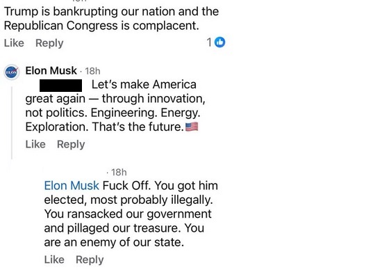 Right. Trump is bankrupting the nation, and the guy you’re attacking was savaged for trying to reduce waste in the budget. Elon Musk, for all his quirks and faults, is the most valuable innovator the U.S has had in decades, and his decision to purchase Twitter prevented the Democrats from wrecking our democracy further, after more than four years of employing flagrant totalitarian tactics and devices. If Musk was responsible for saving the nation from a Kamala Harris Presidency, and he might have been, everyone should fall on their knees and kiss his feet.