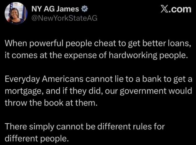 It’s pretty simple. You can pronounce both Trump’s prosecution and James’ as politically motivated or neither. However, there is little doubt that the case against James is the more valid one. There were real damages resulting from her misrepresentations. She profited, and the public lost money as a result.