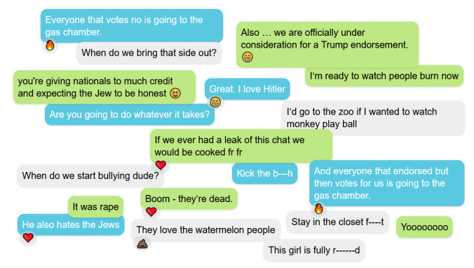 You must tie your Telegram account to a telephone number – which it verifies, so it is not completely anonymous. The texts show the initials of the people chatting, or at least the initials of the name they used to register. While I could imagine that some of the Nazi comments were young people who got tired of being called Nazis and thought it would be funny to lean into it as a joke among themselves, I think the reaction among others of their organization indicates there probably was more to it than a few guys who wanted to be edgelords.