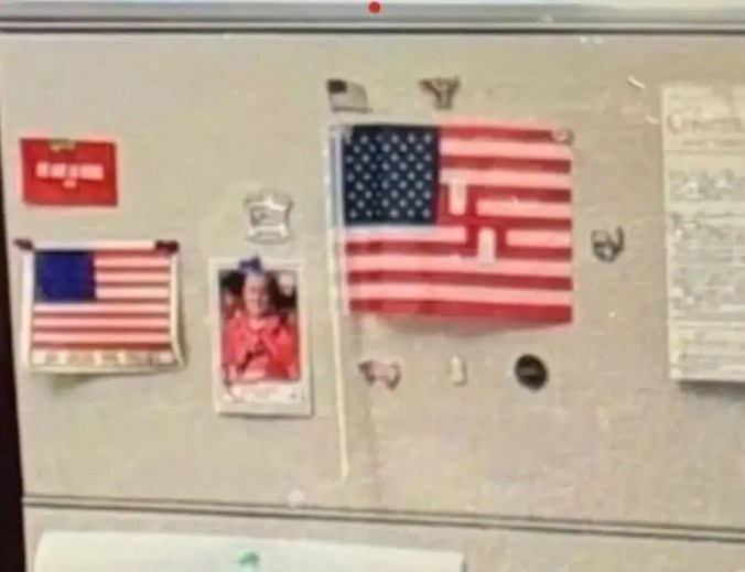 • I would challenge any manager to know at any given time what is displayed in their employees cubicles until it gets reported to them. This flag is created in a manner that is not an in your face Nazi reference. It is camouflaged by the overall flag reference. It is easy to see if you are focused on the items in the cubicle but human beings tend to not see important details with cursory glances. I find the idea that an individual in a zoom meeting would even have the cubicle contents in the background when it takes no talent whatsoever to provide a stock background or a blurred one. More importantly, who did report this and why did no other person on the zoom meeting inform the Congressman if it was so obvious. You would have to assume his entire staff are Nazi sympathizers.