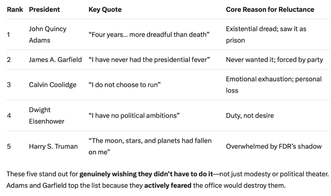 Grok obviously relied on the various President’s public statements to show their “reluctance” rather than their conduct, situation and history. Yes, Garfield was genuinely forced by the Republican convention of 1880 to accept the nomination to break a deadlock when he had arrived as a loyal supporter of Ohio Senator John Sherman, the famous Civil War general’s brother. (Now William Tecumseh Sherman meant it when he said he didn’t want to be President: his “If nominated I will not run, if elected will not serve” (a paraphrase of what he said) is known as “a Sherman,” and Presidential aspirants claiming not to want the job used to be asked, “Will you take a Sherman?” Today most Americans are too historically ignorant to know what that means. But public statements before running and after a President has left office should be taken with massive metaphorical grains of salt. “Yes, I hated every minute of it, but I nobly did my duty for the American people!” is standard post-White House baloney.