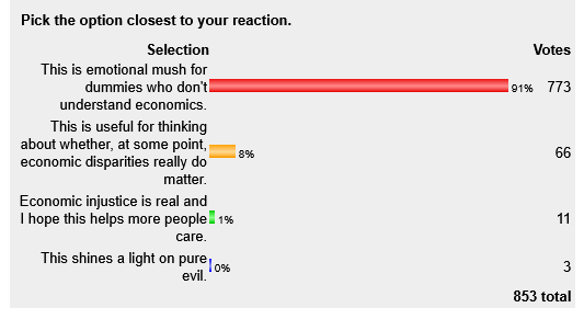 It’s the mechanism of wealth disparity that should matter. If the poorest person has, based on their own efforts, the ability to keep moving upwards (if they so choose), then we don’t have a problem. Do we?