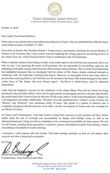 It said in part, “I have serious concerns regarding the writing, approval, and posting process of the Alamo Trust, Inc. (ATI) Communications Team in coordination with ATI leadership…. This is not the first incident that has highlighted personnel who are misaligned with the culture of The Alamo…. Specifically, the second draft of the Visitors Center & Museum (VCM) script, where a ‘Land Acknowledgement’ plaque was to be displayed in the lobby. Additionally, ‘Freedom’ was only mentioned once, ‘Liberty’ a mere 13 times, but ‘Slavery’ and ‘Enslaved’ were mentioned nearly 70 times. This speaks to a pattern of behavior that is completely misaligned with the priorities of my office, and the vast majority of Texans who care so deeply for our Shrine of Liberty.”