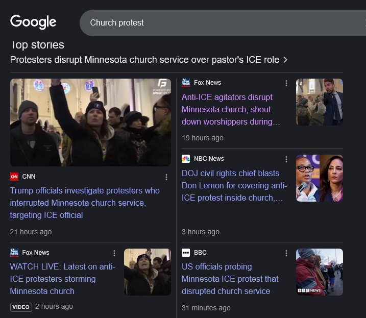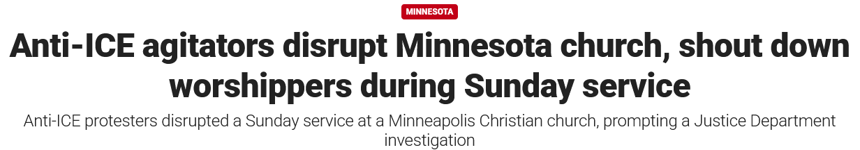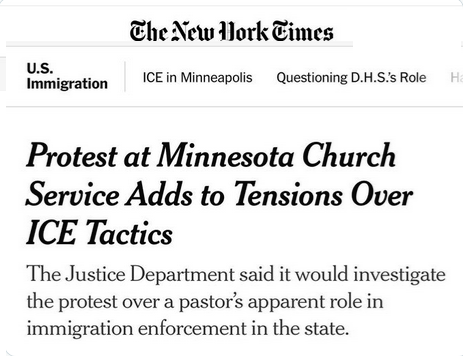 A mob of Minnesota pro-open borders, anti-Rule of Law, insurrection-minded, Jacob Frey toadies and crazies invade a church service and harass parishioners on the pretense that the minister supports immigration enforcement, and the framing of the event by the nation’s alleged “newspaper of record” is to call the trespass and mass assault a “protest” and to focus on I.C.E. tactics when the issue is anti-I.C.E. tactics. The immigration control agency was not involved in this criminal act in any way, yet it is in the headline.