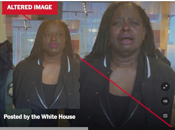 The Justice Department arrested demonstrator Nekima Levy Armstrong, a lawyer, for her part in the illegal protester raid on a church service in St. Paul, Minnesota, along with Don Lemon and other pro-illegal immigrant activists. Homeland Security Secretary Kristi Noem posted an image of the arrest on Twitter/”X” showing Levy Armstrong dignified and composed, walking in front of a law enforcement agent. Karoline Leavitt, the White House press secretary shared that post, but the White House posted a fake, AI-altered version of the arrest in which the lawyer appears to be sobbing. Her skin is also darker. I pasted the original photo next to the fake one above.