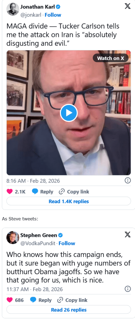 Me: Obama was essentially a black Carter, a weak, feckless President who was a better speaker, and who could call his critics racists. Meanwhile, it’s amusing to see the Axis media rush to Tucker Carlson, that unprincipled weasel, as soon as he criticizes Trump. Please note: I flagged Carlson as fake and a demagogue more than a decade ago. Nobody should care what he says he thinks.