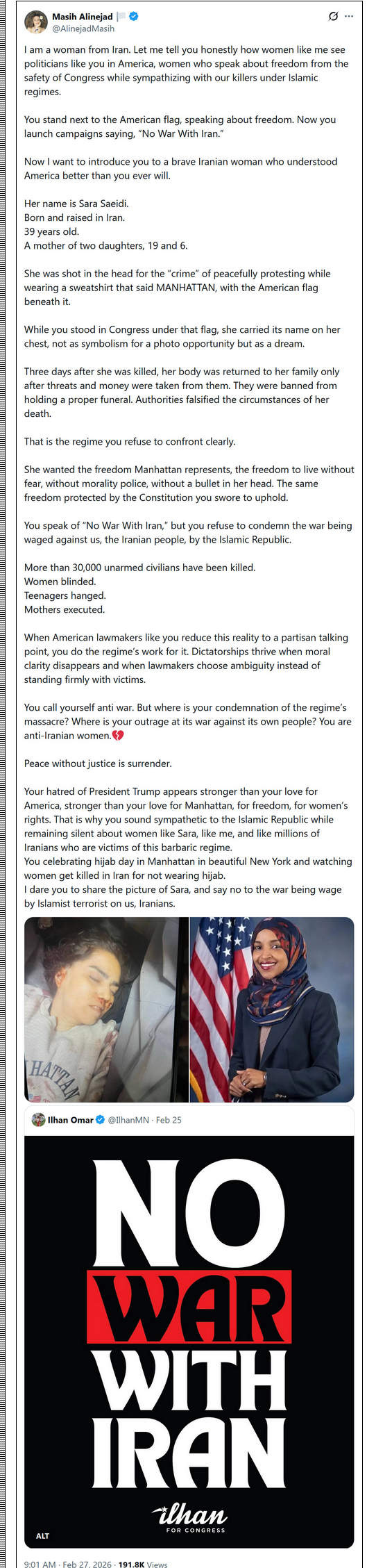 Me: Having Rep. Omar as a member of the Democratic Party all by itself is justification for never trusting that party to do what is in the nation’s best interests.