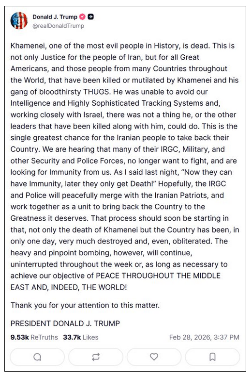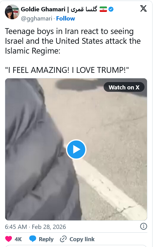 Me: Democrats agreed that when Obama attacked Libya without Congressional approval, the President has Constitutional authority to order such an attack “in the best interests of the United States.” Obviously taking the opportunity to eliminate Iran as an evil-doer in the Middle-East, an existential threat to Israel, a potential nuclear power hostile to the U.S., and to give the Iranian people an opportunity to overthrow a brutal regime which slaughtered dissidents this month, is in the best interests of the U.S.