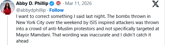 It’s even worse than that. Abby Phillips, the openly biased and incompetent host of CNN’s “NewsNight,”repeated the dishonest Axis media spin that the ISIS attack against a group of protesters outside Gracie Mansion was against NYC’s Muslim Mayor Zohran Mamdani last night.