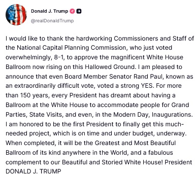 My TDS-suffering sister announced in this week’s Zoom call that she is part of an organization suing the President because of his remodeling of the White House and for the renaming of the Kennedy Center. Apparently, renaming is only bad when Trump does it.