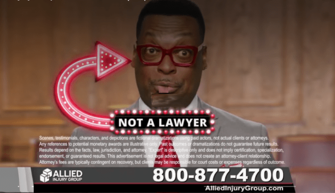 Last year, almost a year ago, I posted this commentary about the Allied Injury Group’s TV ad that embodied all of the horrors the legal profession used for a century to ban lawyer marketing and advertising (thus forgetting about the First Amendment thingy, you know, just like today’s progressives..). In the process, I managed to make an unethical mistake, mislabeling the slimy law firm involved and calling it the Allied Law Group, a non-slimy law firm that was none too pleased. I apologized profusely to the representative of that firm who called to ream me out and made the correction pronto.