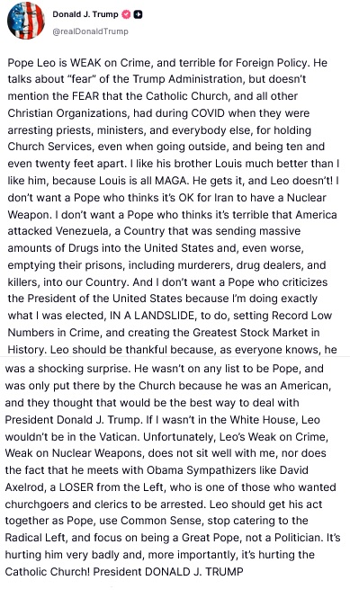The President took to social media again yesterday to announce that he doesn’t like the Pope: