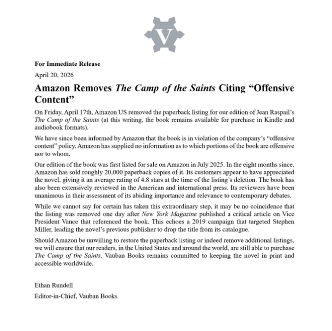 Amazon just censored “Camp of the Saints,” first published in 1973,that portends the destruction of the West as a result of third-world mass migration. Yes, it’s apparently a “Great Replacement” conspiracy theory book.