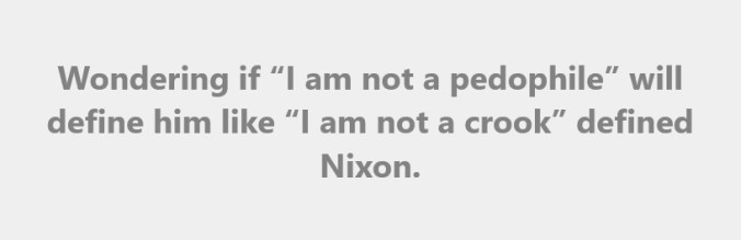 Again, such a post is signature significance for Trump Derangement. No one who isn’t clinically ill with this cerebral malady would ever post such crypto-libel. It might as well have read “I am not a cannibal” or “I am Marie of Romania.” There is no evidence, none, that Donald Trump is a pedophile, yet the Trump Deranged believe it anyway. What did Donald Trump ever do to justify this delusion? How does beating Hillary Clinton in the Electoral College translate into likely pedophilia?