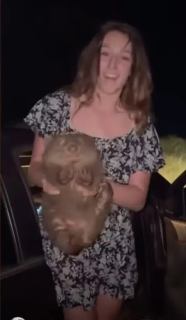 Her current infamy, however, has resulted from the incident shown in the photo under the headline, when she recently, while visiting Australia, snatched a baby wombat from the side of a road and ran to her car with the creature’s furious mother in desperate pursuit. After the “influencer” posted the sequence, it sparked an international incident.