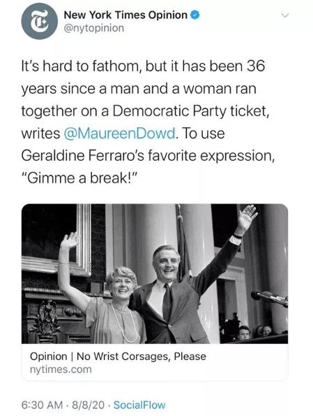 New York Times snarkmistress Maureen Dowd wrote an op-ed bemoaning the fact that no women have been on a Democratic ticket since 1984, when everyone was so sexist and mean to Geraldine Ferraro. Will everyone be so sexist again, now that Joe Biden is trapped into choosing a woman, whether there are any qualified or not?