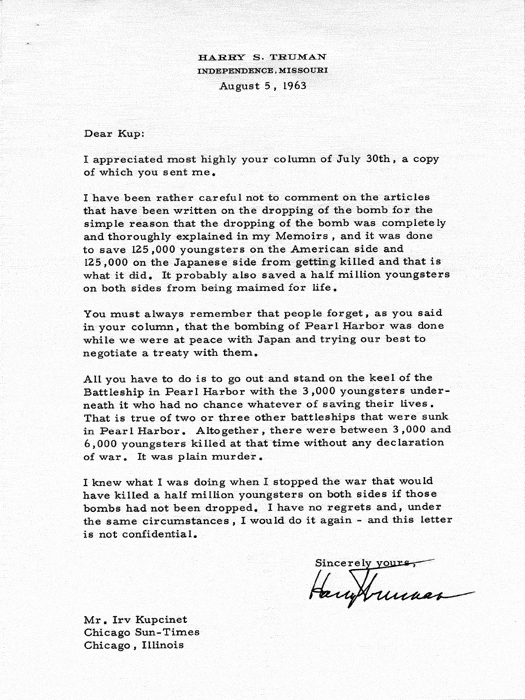 Truman does not reveal himself as a deep thinker, and this can be an asset with decisions like this. As Ellie (Laura Dern) says to John Hammond (Richard Attenborough) in “Jurassic Park” when everything is falling apart and people are getting eaten, “You can’t think your way through this, John. You have to feel it.” The best leaders have an instinct for what is needed, and do it. Here was Truman’s letter to a critic about the issue 18 years later. It’s not especially persuasive; it’s a jumble of the things that were going through his mind.  What matters is that he made the decision, and was able to sleep that night.