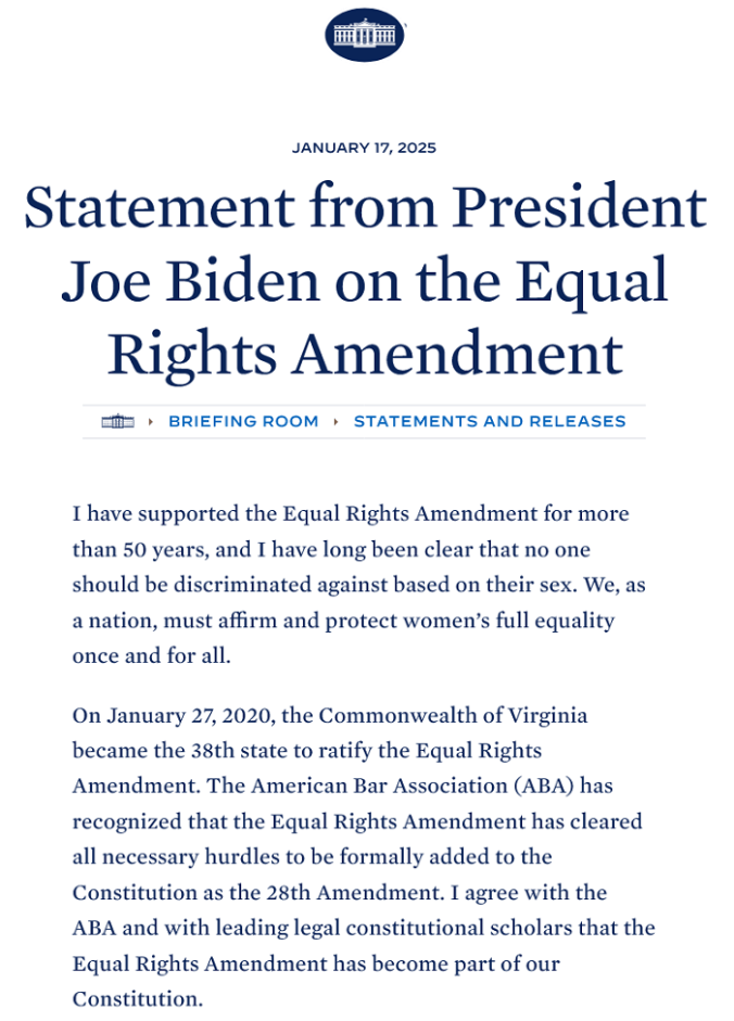 The President has no say whatsoever in when proposed Constitutional amendment have been ratified (or not). He can express his approval of one, and lobby for it with legislators, but he cannot make a ruling that the [completely superfluous, virtue-signaling] Equal Rights Amendment has been properly ratified (it hasn’t been). He might as well put out a statement that Barry Bonds should be voted into the Hall of Fame, or that broccoli is good for you. This is the President whose party made failure to uphold “democratic norms” one of its main Big Lies against Donald Trump, and Biden’s Presidency has ignored more norms than any Presidency at least since FDR tried to be President For Life. (Come to think of it, he succeeded!)