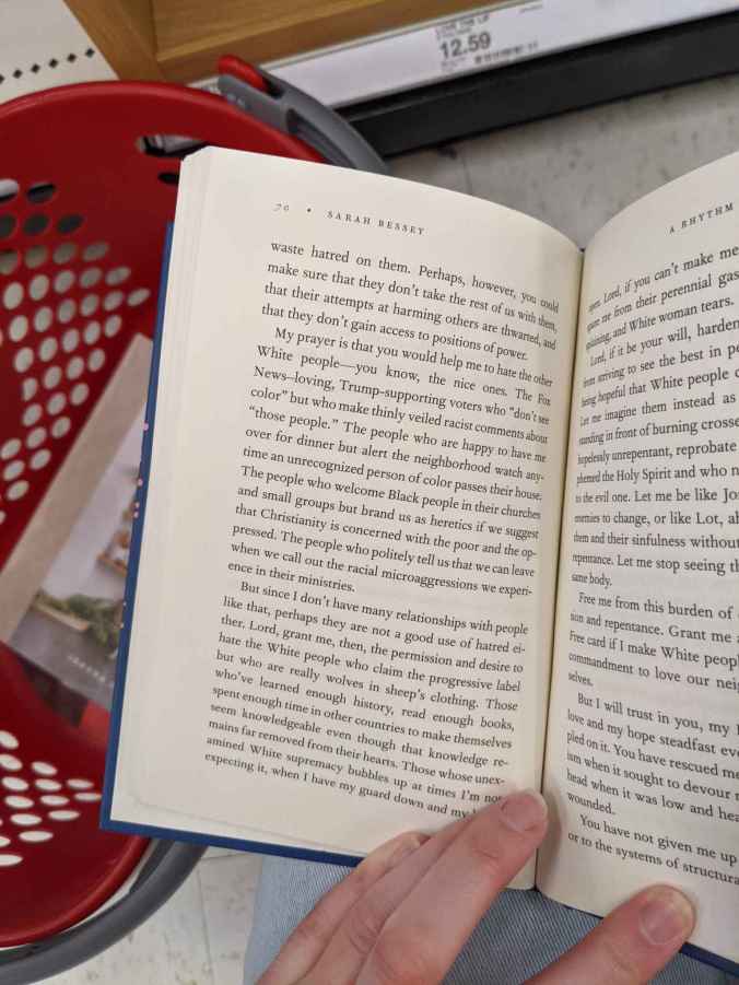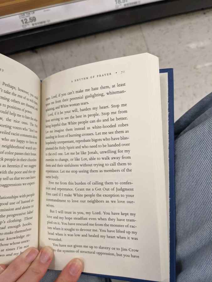 This is an essay in a “devotional” titled “A Rhythm of Prayer” by Sarah Bessey. Containing pieces by many authors, it is available on Amazon. Target sells it online for $14.87 in its “Religion + Beliefs” section and “Christian Life” subsection. It is selling well, I hear. The anti-white screed above was authored by Professor of Theology Chinequa Walker-Barnes of Mercer University.