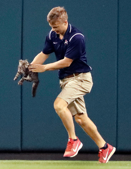 Last week, the St. Louis Cardinals, fighting to overtake the Cubs in the closely contested and mediocre National League Central, were trying to rally back from looming defeat. The bases were loaded with Cardinals at Busch Stadium when a juvenile cat raced onto the field and halted play. A groundskeeper captured the cat, which mauled him as he carried it off the field. This was shown on the video scoreboard, provoking laughter and applause from the crowd.