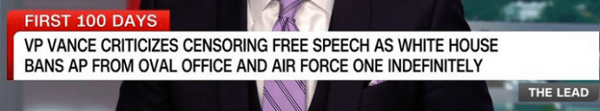 That’s the chest of CNN’s Jake Tapper above. He was making a little frowny-face yesterday for the idiots viewing CNN who are too dim to realize that the accusatory headline is a non-sequitur, like “I like ice cream, can you swim?” The White House suspending the AP’s White House privileges—that’s privileges, which are distinct from rights, Jake—has nothing to do with freedom of speech or even the First Amendment, so the implied hypocrisy is more fake news.