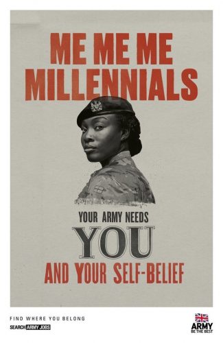 1. Virtue signaling and pandering are both inadequate to describe this. If only it were a joke—but it appears to be proof of institutional  brain rot.  The British army is reaching out to “selfie addicts,” “snowflakes,” “me me me millennials”—remember, I’m not making this up!—“class clowns”, “binge gamers”,and  “phone zombies”  celebrating the alleged virtues these juvenile behaviors demonstrate, such as self-belief, spirit, drive, focus, compassion and confidence. Here are two examples of the new posters: