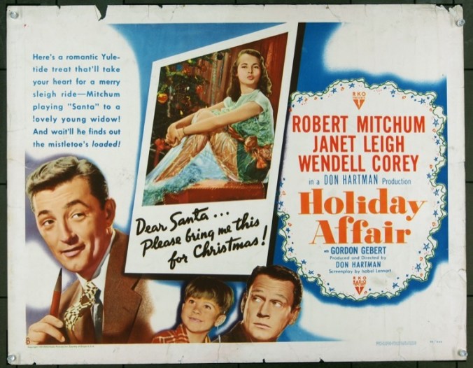 Related: Last night I saw the 1949 Christmas film “Holiday Affair,” starring Robert Mitchum and Janet Leigh. It’s low key but fun and well acted. It also has a scene where Mitchum walks into the kitchen as single mother Leigh is doing dishes, grabs her without warning or consent and gives her a long, hard kiss on the mouth as her arms flail helplessly.