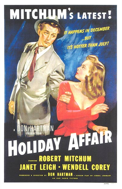 …which misrepresents the movie entirely, especially Leigh, who is never seen in such a pose. That’s nothin’, though. When the movie was a box-office bomb, they decided that it was because nobody wanted to see film noir tough guy Mitchum being nice, charming and polite (his character resembles John Payne in “Miracle on 24th Street”). So they put out this poster, which is outright misrepresentation: