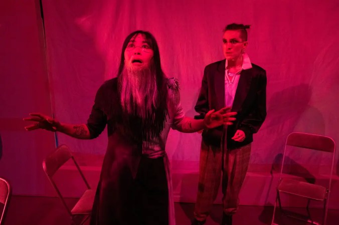 But the Target Margin Theater production of the Bard’s Bomb tries some things. For example, the convoluted plot of “Pericles” gets started with the revelation that a nasty king, having lost his wife, has turned to his beautiful daughter “with whom the father liking took and her to incest did provoke.” However in this production, that line is rendered as, “The dude sleeps with his daughter.”
